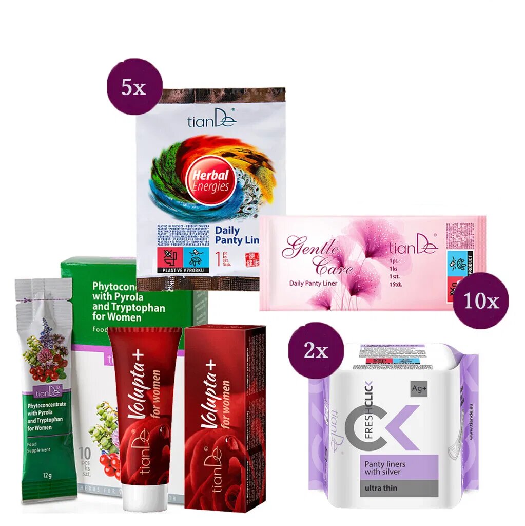 Das natürliche Paket zur umfassenden Unterstützung der Frauengesundheit kombiniert die hormonelle Harmonisierung mit der Pflege des Intimbereichs. Es enthält ein Phytokonzentrat für das hormonelle Gleichgewicht, therapeutische Pads mit pflanzlicher Phytomembran, Slipeinlagen mit Silber und Intimgel mit L-Arginin. Als Geschenk erhalten Sie den Kräutertee Healthy Woman, der das Wohlbefinden während der Menstruation und in den Wechseljahren unterstützt. Ideal für Frauen zwischen 35 und 55 Jahren, die eine natürliche Lösung für ihr hormonelles Gleichgewicht, ihre Gesundheit im Intimbereich und ihre allgemeine Vitalität suchen. Umfassende, von der traditionellen chinesischen Medizin inspirierte Pflege für die moderne Frau.
