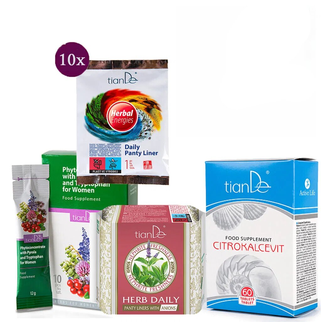 Ein umfassendes Paket zur Unterstützung des hormonellen Gleichgewichts und der Gesundheit von Frauen mit natürlichen Produkten von tianDe. Enthält Phytokonzentrat für hormonelle Harmonie, Kalziumkomplex für Energie und gesunde Knochen, Kräuterpads für die Gesundheit im Intimbereich und Healthy Woman Tee als Geschenk. Ideal für Frauen zwischen 35 und 55 Jahren, die einen natürlichen Weg zu Vitalität und Wohlbefinden während der Menstruation und der Menopause suchen.