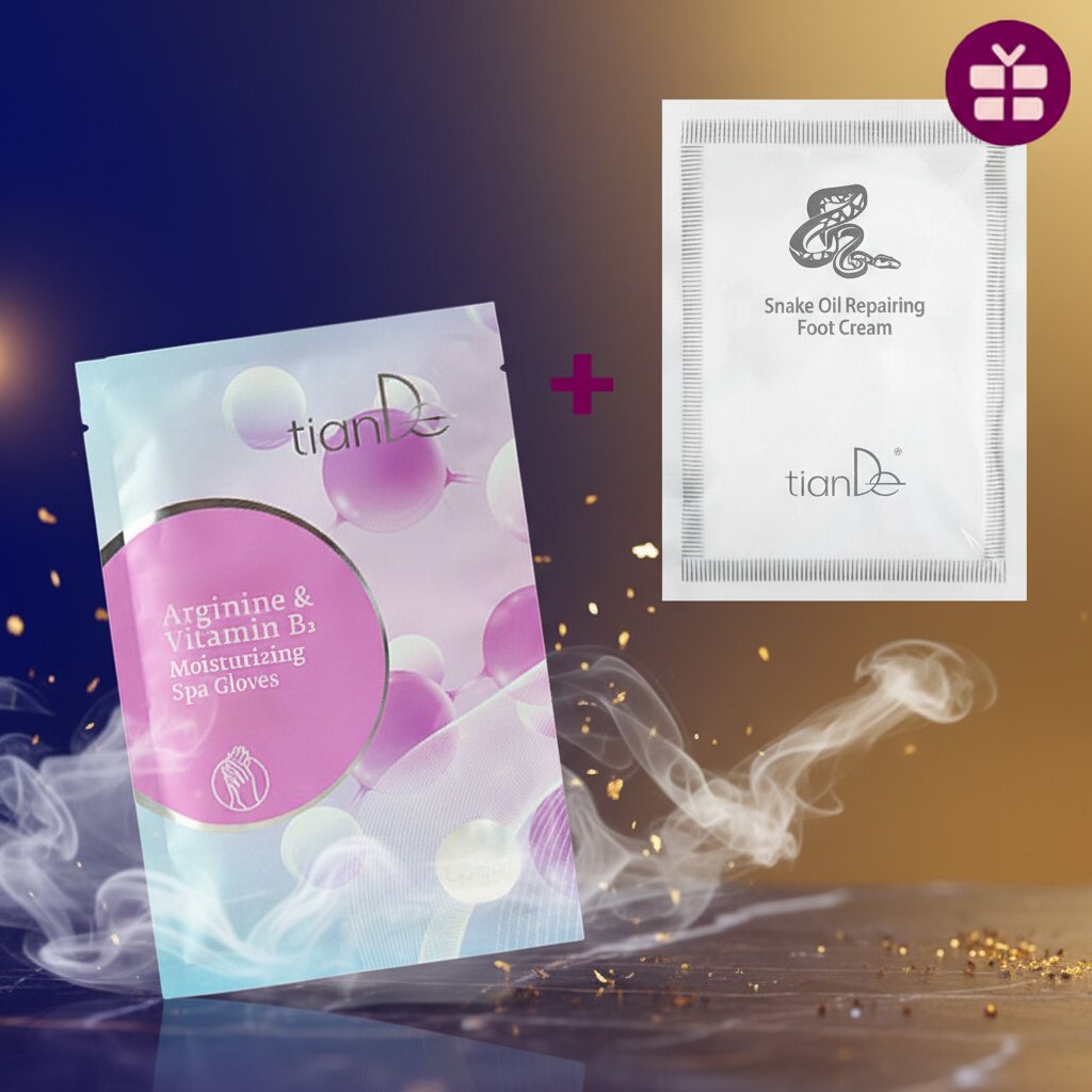 Gönnen Sie Ihren Händen und Füßen eine professionelle Spa-Behandlung bequem von zu Hause aus. Dieses praktische Paket kombiniert feuchtigkeitsspendende Spa-Handschuhe mit Arginin zur sofortigen Regeneration trockener Hände und eine kostenlose regenerierende Schlangenölcreme für müde Füße! Die natürliche Formel von TianDe nährt, pflegt und schützt die strapazierte Haut bis in die Tiefe.